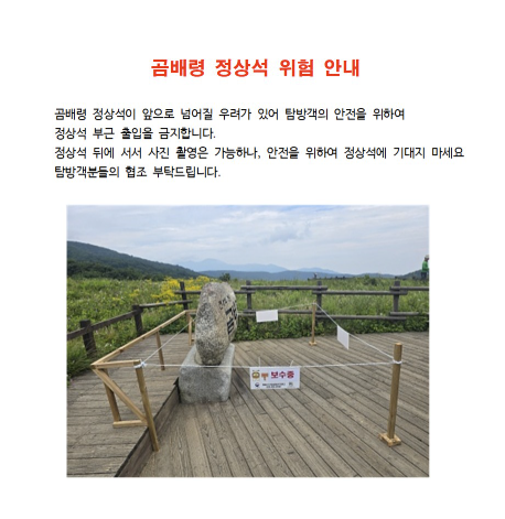 - 날씨 확인 : 탐방 전 날씨를 꼭 확인하시고, 악천후 시에는 탐방을 자제하는 것이 좋습니다.