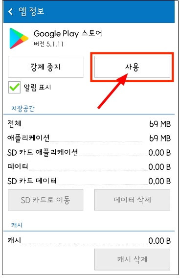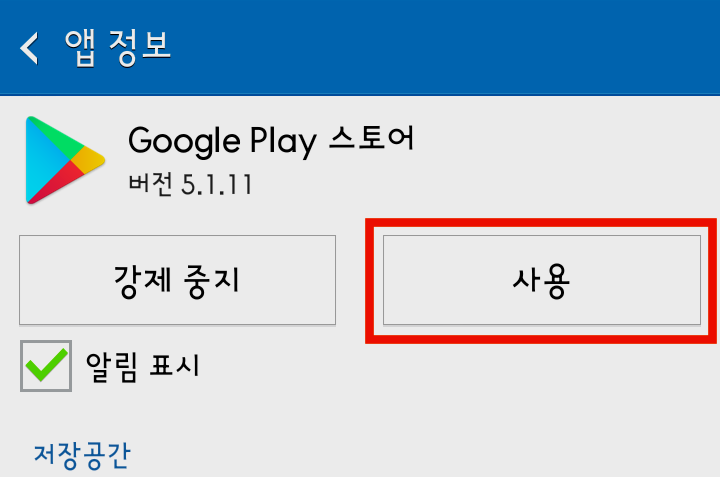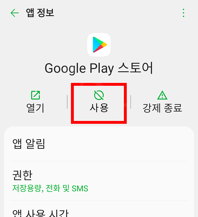 - A: 기기의 설정에서 애플리케이션 관리로 들어가서 플레이스토어를 찾아 활성화해보세요.