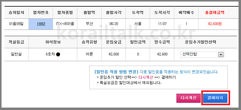 원하는 기차를 선택하고, 좌석을 지정한 후 결제를 진행하면 기차표가 예매됩니다.
