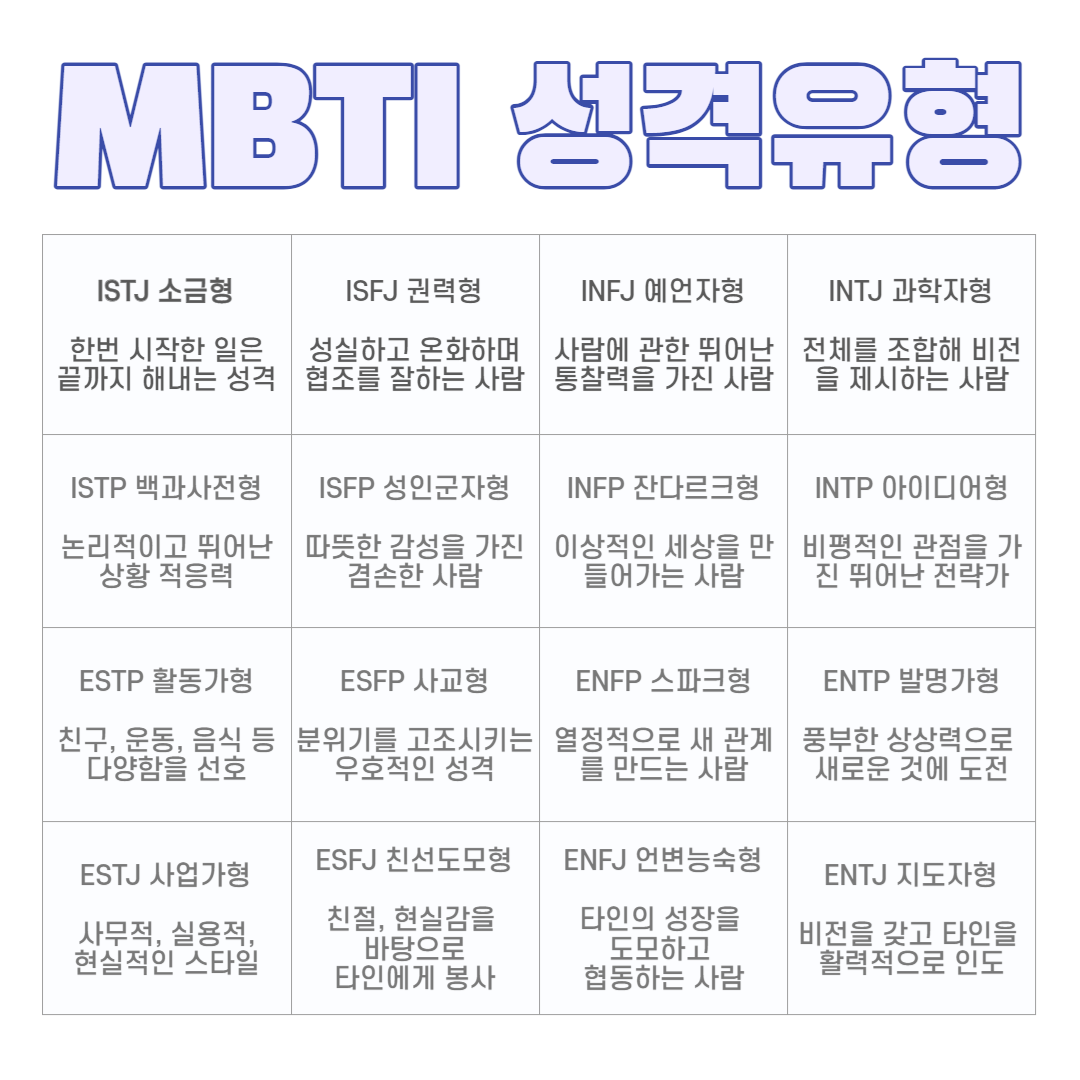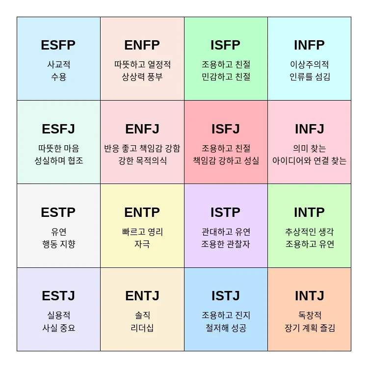 MBTI는 다음과 같은 16가지 성격 유형으로 나뉩니다: