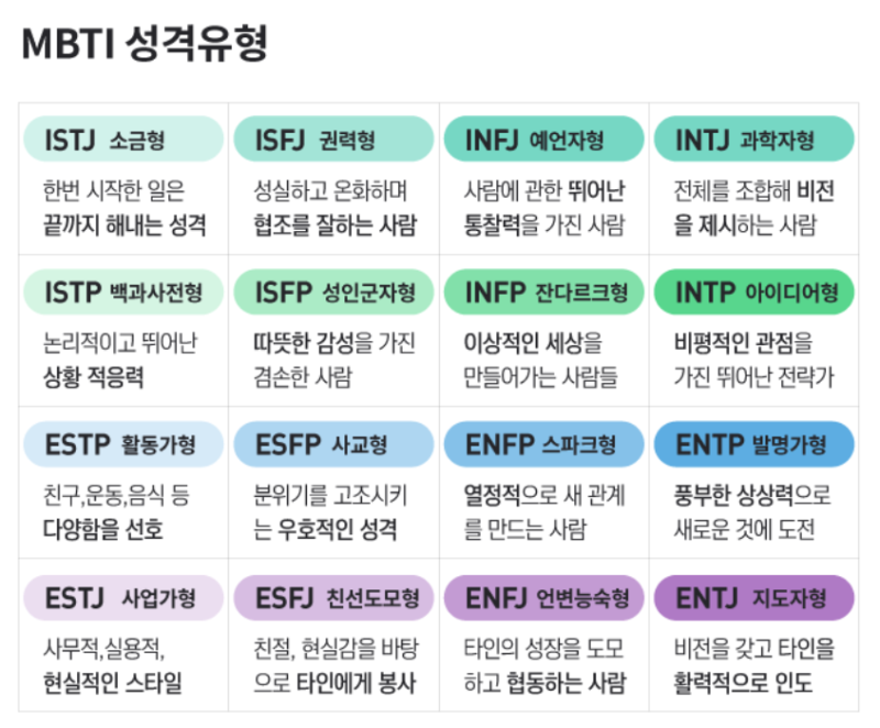 MBTI 성격 유형의 16가지 분류