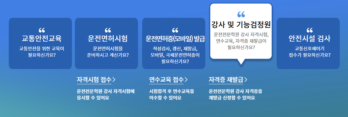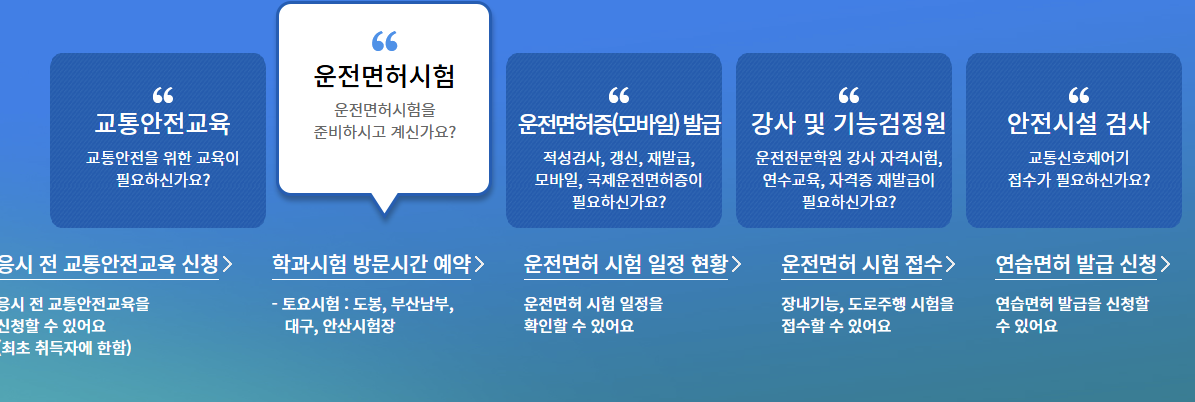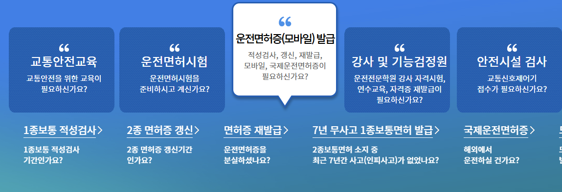 이 홈페이지를 통해 운전면허증 발급, 갱신, 적성검사 등 여러 가지 민원을 간편하게 처리할 수 있습니다.
