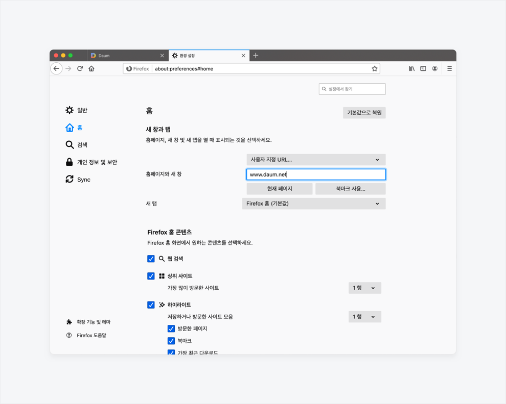 다음을 자주 사용하는 사용자라면, 다음을 시작페이지로 설정하는 것이 좋습니다.