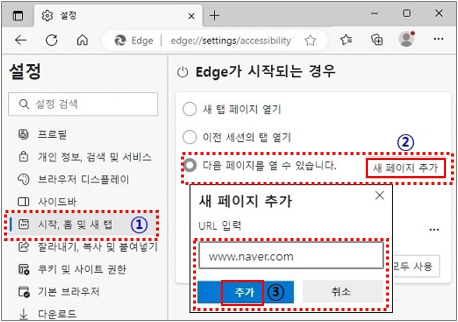 - '특정 페이지 열기'를 선택한 후 '새 페이지 추가' 버튼을 클릭합니다.