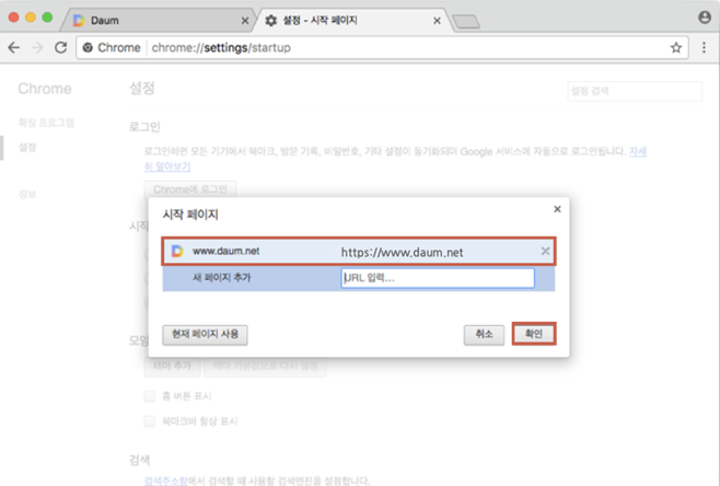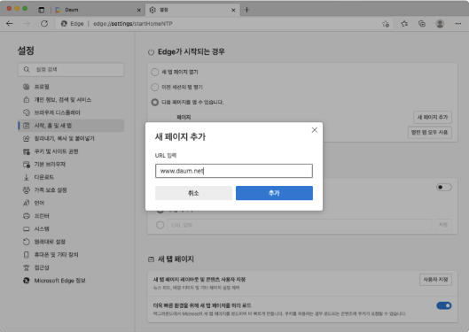 - '새 페이지 추가' 버튼을 클릭하고 www.daum.net을 입력한 후 추가 버튼을 클릭합니다.
