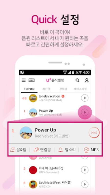 - 컬러링 선택 : 제공되는 다양한 컬러링 목록에서 원하는 곡을 선택합니다. 미리 듣기를 통해 확인할 수 있습니다.