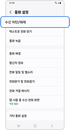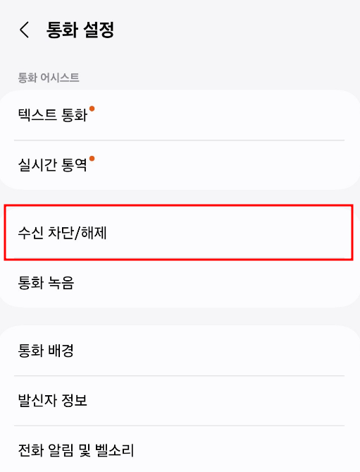 - [설정]을 선택한 후, [수신 차단/해제] 메뉴로 이동합니다.